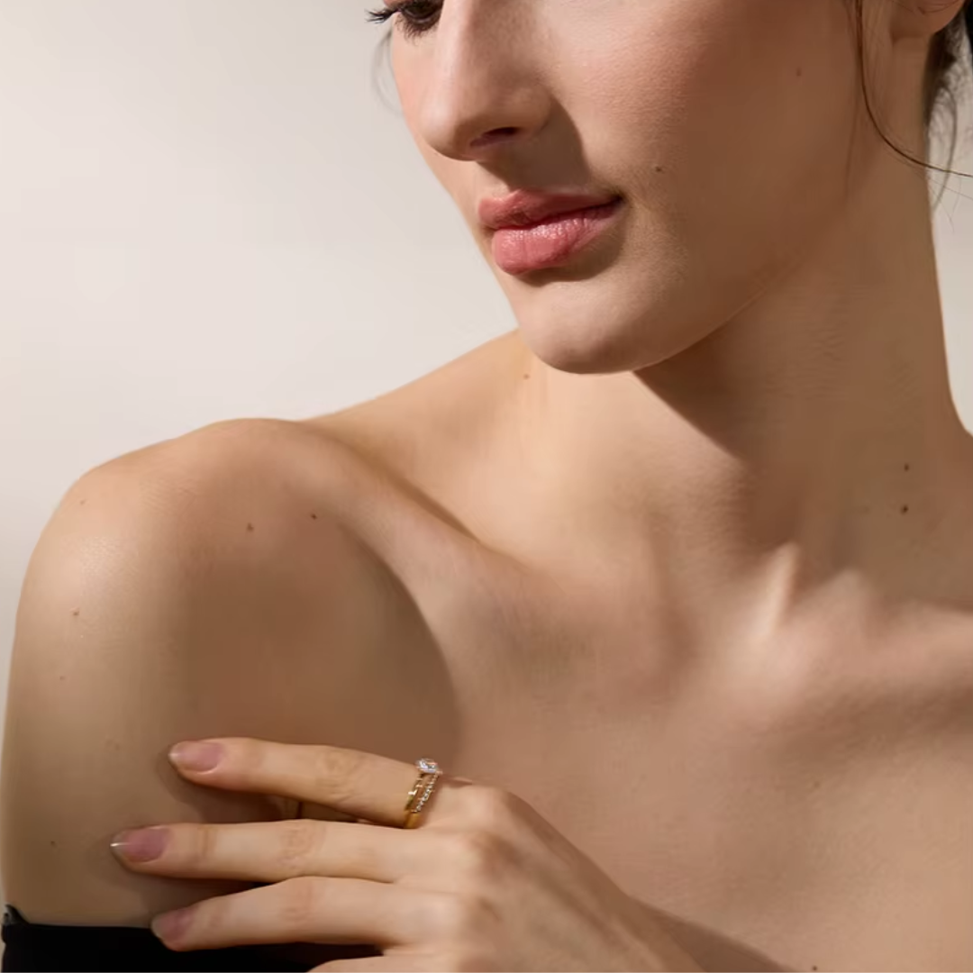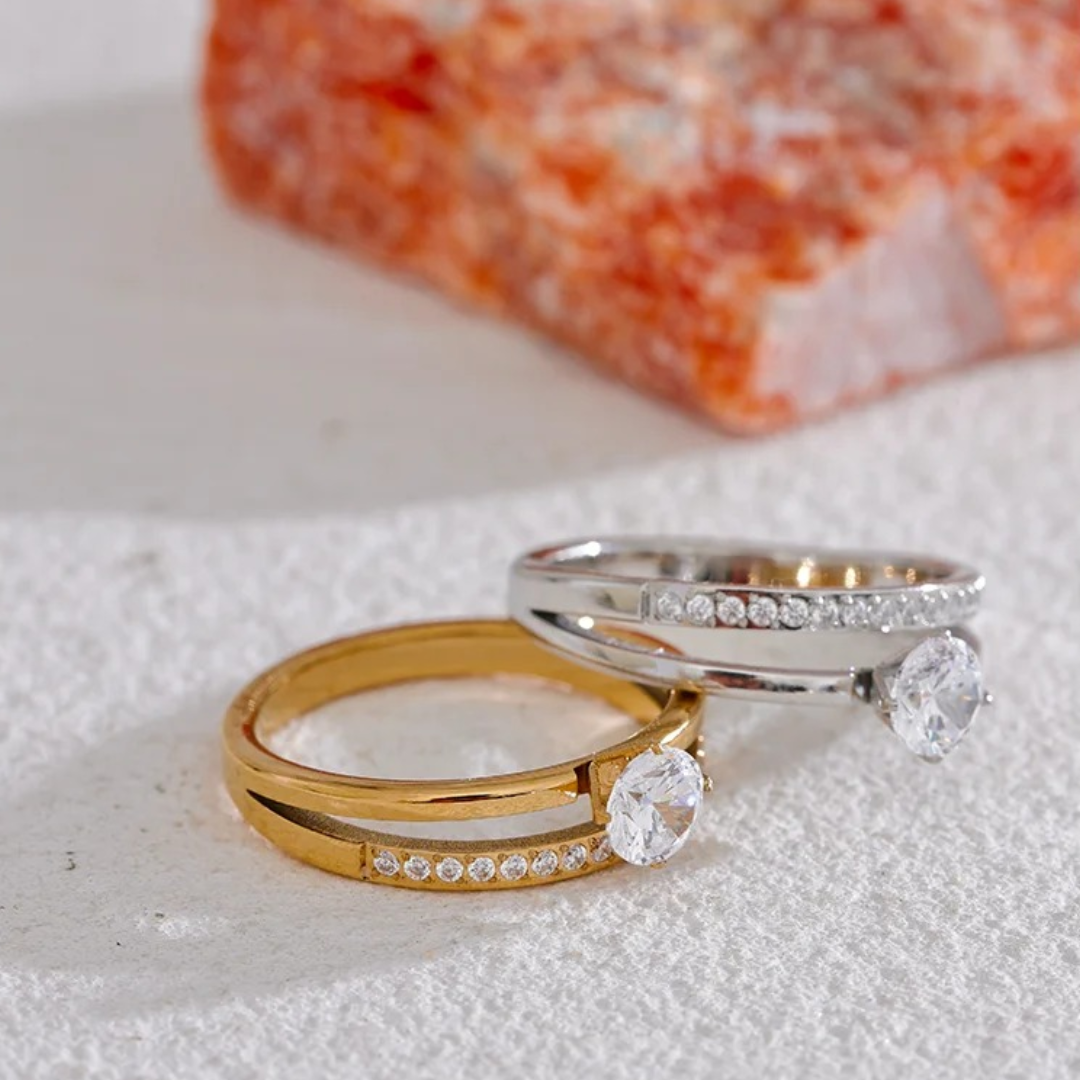 Sleek double-layer structure with a solitaire zircon and pavé-set accents.