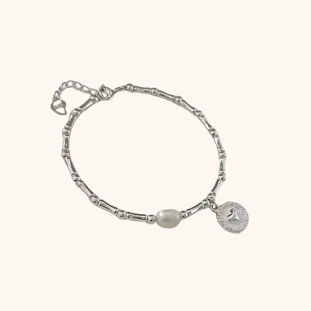 Freshwater pearl and textured heart charm for a soft romantic touch.